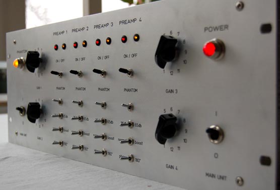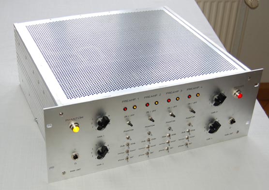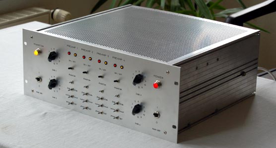Ziel des nachfolgend beschriebenen Projekts war es, eine hochwertige Gehäuselösung für vier V72-Module zu schaffen. Die Preamps waren mit Phantomspeisung, Gainregelung und Betriebsspannung zu versehen. Auf Ausstattung mit DI-Eingängen habe ich bewusst verzichtet, da mir hierfür separate, hochwertige DI-Boxen zur Verfügung stehen, die ich bei Bedarf mit allen vorhandenen Preamps kombinieren kann. Auch auf einen Phasendrehschalter habe ich bewusst verzichtet, da die Möglichkeit der Phasendrehung mittel nachgeschalteter Verstärkermodule realisiert werden kann.