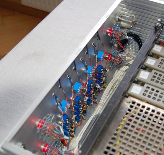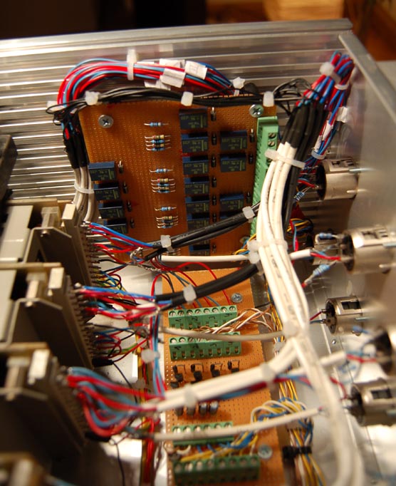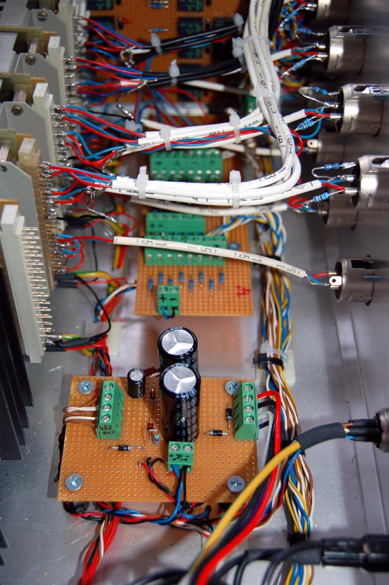 Zunächst wurden alle Gehäuseteile sowie die Preamps und das 24V-Netzteil mit Erdungskabeln versehen, die wiederum mit dem Erdungskabel des 230V Anschlusses verbunden sind. Details hierzu sind hier zu finden. Der 230V Eingang wurde mit einer Sicherung und den frontseitigen Schaltern für Power und Phantom Power verbunden. Der Ausgang des +24V-Netzteils dient zur Speisung der Module, die sich zudem über separate Schalter einzeln aktivieren lassen. Daneben werden die Status-LED's (Ein/Aus) der Einzelmodule und die im folgenden erwähnten Relais mit Strom versorgt. Die Vorwiderstände der LED's wurden direkt an den LED's angebracht. Erwähnenswert erscheint mir zudem, dass sämtliche Relais mit Dioden zu versehen sind. Die Spulen der Relais erzeugen bei den Schaltvorgängen negative Spannungsspitzen von mehreren Dutzend Volt, die ohne die Parallelschaltung einer Diode andere Komponenten der Schaltung beschädigen oder zerstören könnten. Details zur Beschaltung von LED's und Relais finden sich hier.
