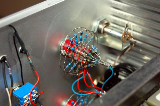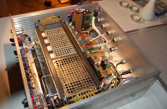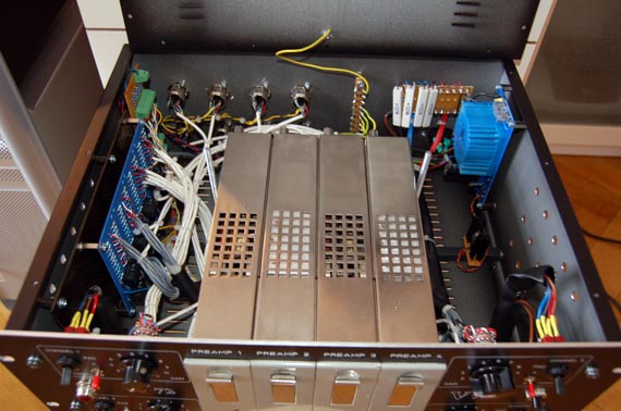 Zunächst wurden alle Gehäuseteile sowie die Preamps mit Erdungskabeln versehen, die sternförmig in das Erdungskabel des 230V Anschlusses münden. Um die Röhren nicht verwendeter Module zu schonen, habe ich die Module - neben dem Hauptschalter - mit einzelnen Ein/Aus-Schaltern versehen. Sämtliche Zuleitungen wurden innerhalb des Gehäuses mittels Metallgeflechtschlauch nochmals geschirmt um unnötige Einstreuungen in die Audio-Verkabelung zu vermeiden.
