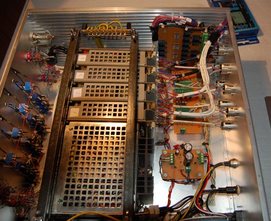 Für das Gehäuse habe ich ein Aluminium-Gehäuse der Firma Schroff gewählt. Die Bearbeitung der Front- und Rückseite wurde von der Firma Schaeffer vorgenommen, die ein entsprechendes CAD-Programm kostenlos auf ihrer Website zum Download zur Verfügung stellt (FrontDesign). Die mechanische Fixierung der Module wurde mittels stabiler Metallvollprofile aus dem Baumarkt vorgenommen, die sowohl in den Seitenteilen als auch auf dem Boden des Gehäuses verschraubt wurden. Eine stabile Konstruktion ist notwendig, da die Module nebst Netzteil einige Kilogramm auf die Waage bringen.